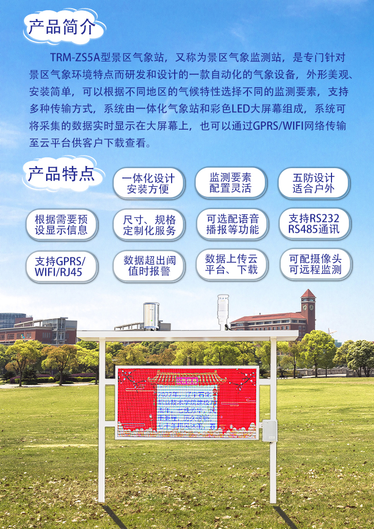 TRM-ZS5A型景區(qū)氣象站,又稱為景區(qū)氣象監(jiān)測(cè)站,是專門針對(duì)景區(qū)氣象環(huán)境特點(diǎn)而研發(fā)和設(shè)計(jì)的一款自動(dòng)化的氣象設(shè)備,外形美觀、安裝簡(jiǎn)單,可以根據(jù)不同地區(qū)的氣候特性選擇不同的監(jiān)測(cè)要素,支持多種傳輸方式,系統(tǒng)由一體化氣象站和彩色LED大屏幕組成,系統(tǒng)可將采集的數(shù)據(jù)實(shí)時(shí)顯示在大屏幕上,也可以通過(guò)GPRS/WIFI網(wǎng)絡(luò)傳輸至云平臺(tái)供客戶下載查看。