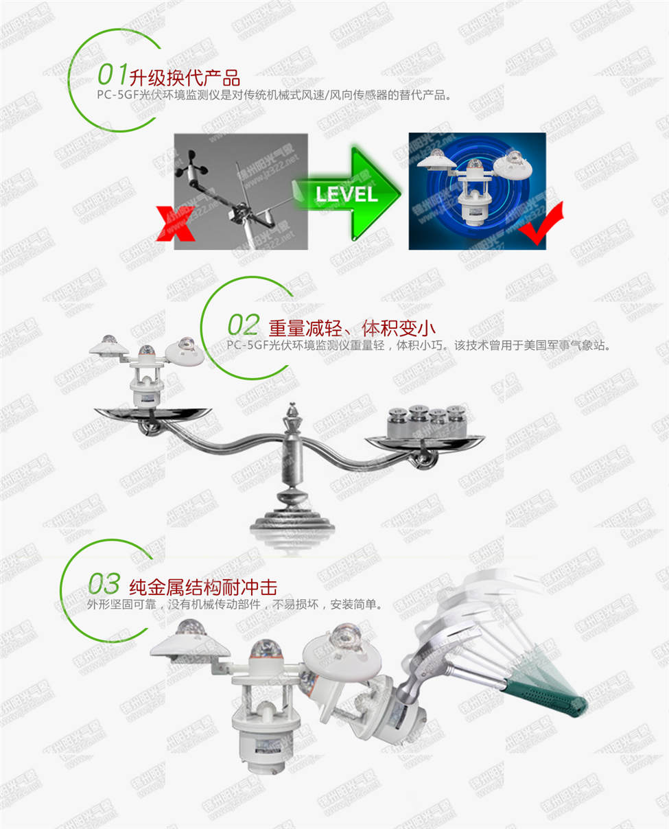 本產(chǎn)品除了可同時監(jiān)測環(huán)境溫度、環(huán)境濕度、風(fēng)速、風(fēng)向、氣壓、雨量五大環(huán)境基本要素外,還可以監(jiān)測光伏電站環(huán)境系統(tǒng)中所必須的太陽輻射(水平/斜面)及組件溫度等要素。特別采用了高穩(wěn)定性的太陽總輻射傳感器,具有完美的余弦特性、快速響應(yīng)、零漂移和寬溫度響應(yīng)的特性,非常適合太陽能行業(yè)的輻射監(jiān)測使用,兩臺角度可以任意旋轉(zhuǎn)的總輻射表可滿足光伏行業(yè)光功率預(yù)算需求,是目前最適合光伏電站上使用的領(lǐng)先級的一體化便攜光伏環(huán)境監(jiān)測儀。