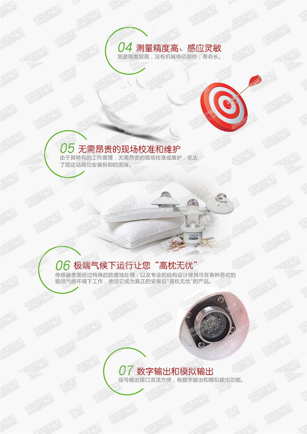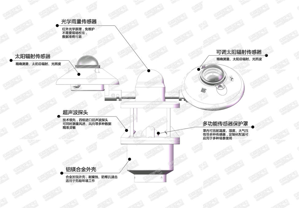 3. 采用先進的監(jiān)測技術(shù),風(fēng)速風(fēng)向的監(jiān)測采用了超聲波技術(shù),不但測量精度高,性能穩(wěn)定,而且無需維護;雨量的監(jiān)測采用了光學(xué)的原理,體積小巧、免維護,更適于用在無人值守的現(xiàn)場。
