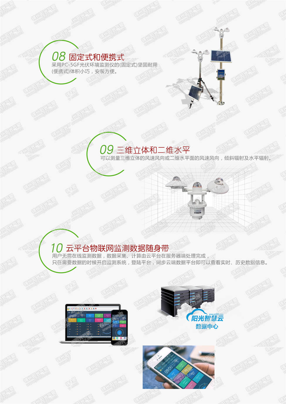 7. 可實現(xiàn)網(wǎng)絡(luò)化基站布點模式,可以實現(xiàn)多點氣象站布網(wǎng)監(jiān)測,通過陽光云平臺即可滿足局域網(wǎng)內(nèi)數(shù)據(jù)共享查看,也可通過GSM/GPRS/CDMA等無線網(wǎng)絡(luò)方式實現(xiàn)異地遠程監(jiān)測。