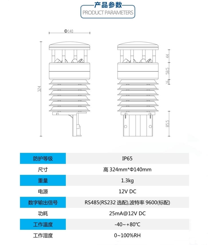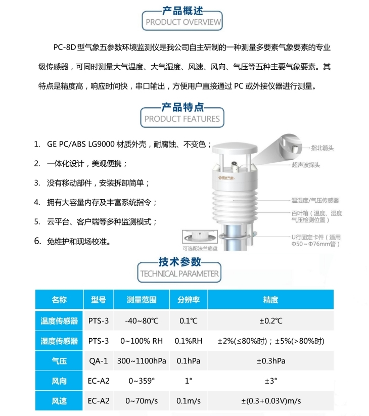 PC-8D型氣象五參數(shù)環(huán)境監(jiān)測儀是我公司自主研制的一種測量多要素氣象要素的傳感器,可同時測量大氣溫度、大氣濕度、風速、風向、氣壓等五種主要氣象要素。其特點是精度高,響應時間快,串口輸出,方便用戶直接通過PC或外接儀器進行測量。