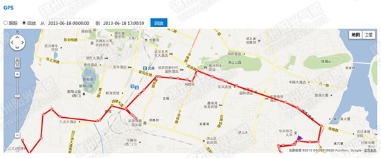 用戶可在平臺上通過在線電子地圖(Google Map、Baidu地圖等)總體瀏覽用戶所有設(shè)備的地理位置,查看某位置設(shè)備的詳細(xì)信息。在電子地圖上也可以通過縮放地圖,更加細(xì)致地瀏覽設(shè)備。用戶也可在平臺上直接查看GPS類型的傳感器數(shù)據(jù),將每個數(shù)據(jù)點用直線連接,繪制成一條運動路徑。如下圖所示: